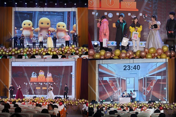 晚会还设置了抽奖互动环节,现场气氛十分活跃。情景剧《白雪公主与七个大高个》以幽默诙谐的方式演绎经典故事,引发了观众的阵阵笑声。小品《期末复习之时间都去哪儿了》则贴近校园生活,引起了师生们的共鸣。
