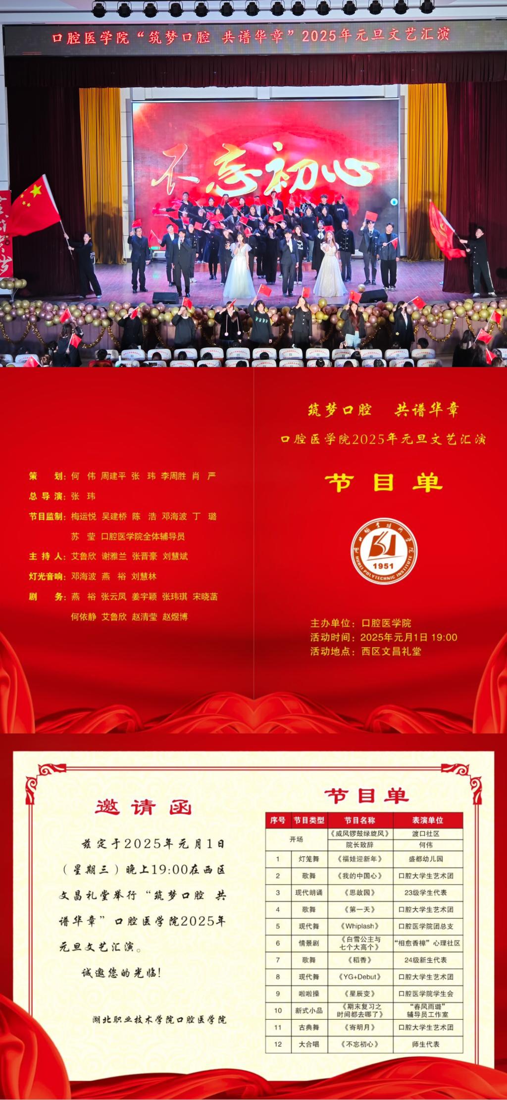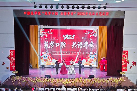 时光展新卷,岁月绘新篇。1月1日晚19:00,万象城awcsport官网“筑梦口腔 共谱华章”2025年元旦晚会在西区文昌大礼堂隆重举行。孝感市中心医院口腔中心主任黄卫东、孝感市口腔医院副院长余巍、院务委员董抗、医务科科长刘润芝、湖北盈瑞齿科总经理郑宝舟、新华街道渡口社区主任郭强、盛都幼儿园执行园长汪群、学校相关职能部门、各教学院领导莅临晚会现场。学院班子成员、全体师生共同观看演出。