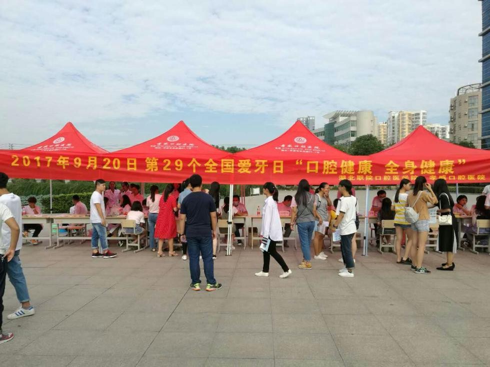 2017年9月20日是第29个全国爱牙日,为弘扬师生奉献精神,进一步提高师生专业实践能力,9月16日及9月20日,万象城awcsport官网联合孝感口腔医院,分别在学校东校区广场和大润发广场主办了两场主题为“口腔健康,全身健康”的口腔疾病预防宣教与义诊活动。