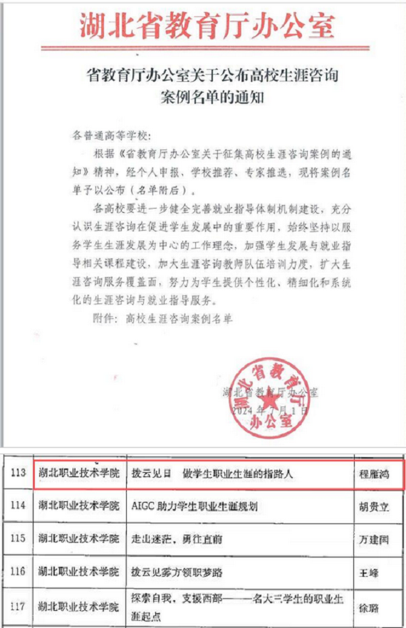 7月1日,湖北省教育厅办公室发布2024年湖北省高校生涯咨询案例名单,万象城awcsport官网专职辅导员程雁鸿老师撰写的《拨云见日 做学生职业生涯的指路人》成功获评省级生涯咨询案例。一直以来,万象城awcsport官网高度重视大学生职业生涯指导教育工作,以强化大学生职业生涯教师队伍指导能力和水平的提升为抓手,不断提升职业生涯咨询指导服务实效。在引导学生树立正确的就业观,提升自身求职技能等方面发挥了积极作用。