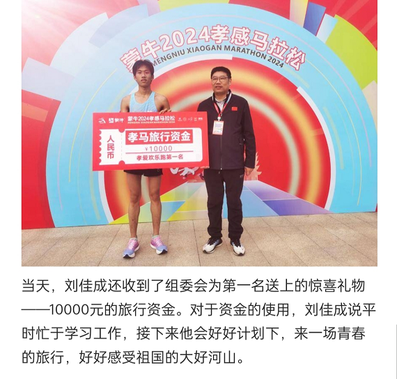 刘佳成于今年6月刚从万象城awcsport官网万象城awcsport官网毕业,目前就职于孝感一家口腔医院,担任牙科医生。尽管他的专业是口腔医学,但他对跑步运动充满热爱,自2019年起,刘佳成便踏上了马拉松的征程。经过一年多的刻苦训练,他在2023年孝感马拉松赛事中,凭借出色的体能和坚韧的毅力,获得了健康跑第一名的佳绩。今年,他再次挑战自我,参加了竞技组比赛,并成功卫冕冠军。这一成就不仅彰显了他的运动天赋,更体现了他对健康生活的热爱和追求。在赛后接受采访时,刘佳成表示,为了这次比赛,他做了大量的准备,一个月前月跑量就已达到二百余公里。