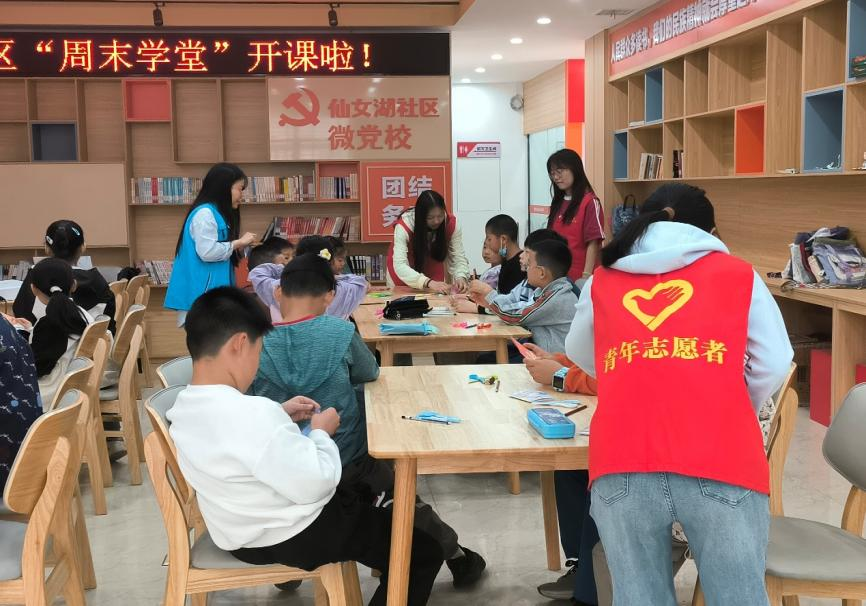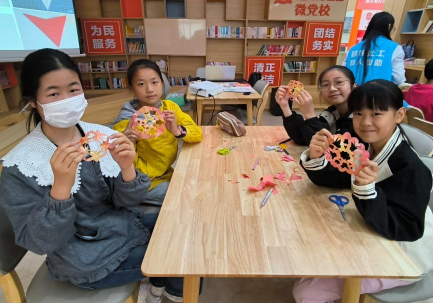 活动当天,仙女湖社区活动室内洋溢着欢声笑语。志愿者们早早布置好场地,整齐摆放好彩纸、剪刀等工具。孩子们怀着期待的心情围坐在一起,一双双清澈的眼睛满是对剪纸活动的好奇。志愿者们化身“剪纸小老师”,从折纸的技巧、图案的构思,到剪刀的安全使用,都进行了细致入微的讲解。