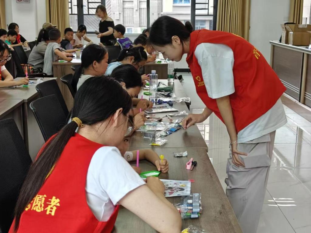 活动现场,志愿者们一对一或小组式地陪伴在孩子们及其家人身旁,提供全程协助,志愿者们帮助孩子们挑选合适的钻石颜色,指导他们使用点钻笔精准粘贴,并适时给予鼓励。