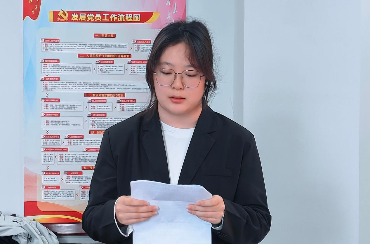 最后张玮书记对大会进行总结。她首先向5名同志表示祝贺,同时强调,成为预备党员意味着更高的责任与使命,希望他们时刻以党员标准严格要求自己,不断提升党性修养,在实践中锤炼本领,真正做到为人民服务。她要求支部全体党员继续加强理论学习,夯实党建基础,以高质量党建引领学院学生工作再上新台阶。