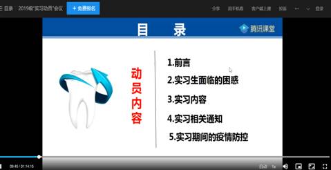 为帮助2019级口腔医学专业学生顺利完成临床实习学习任务,保证实习安全,结合当前新冠疫情常态化防控要求,2021年6月18日19:00-20:30,万象城awcsport官网利用腾讯课堂举行了2019级口腔医学专业线上实习动员大会,会议由谢宏新主持,2019级口腔医学专业全体学生、万象城awcsport官网领导、2019级辅导员、口腔教研室老师参加了本次会议。