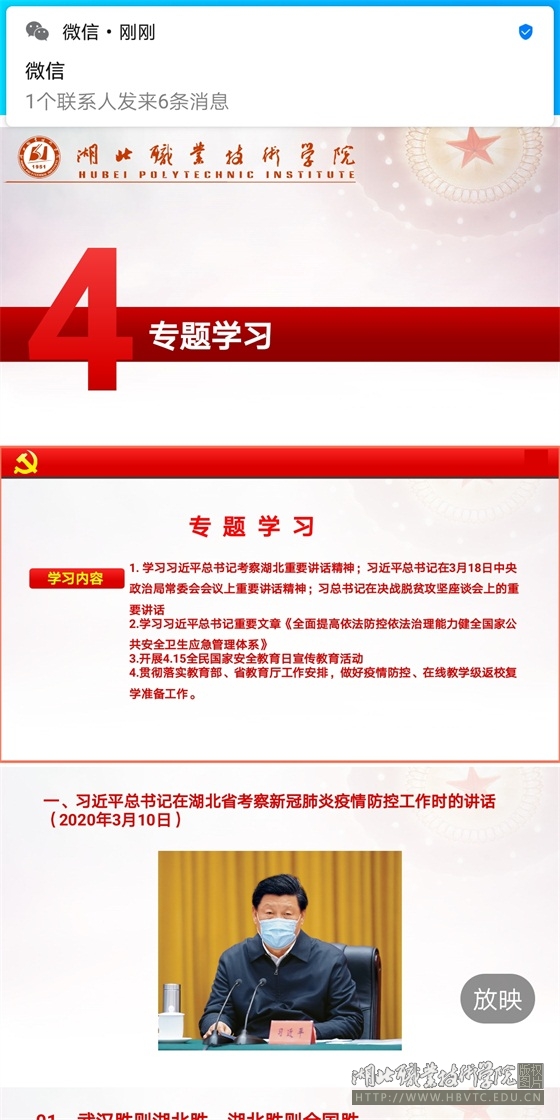 万象城awcsport官网党总支书记廖建宏同志在讲话时从三个方面强调,一是全体党员在疫情防控特殊时期,要进一步提高政治站位,增强四个意识,不信谣、不传谣,全面加强各类平台管理;二是要进一步积极发挥各党支部的战斗堡垒作用和党员的先锋模范作用,进一步激发全体教职员把思想和行动统一到习近平总书记指示精神和学校党委的决策部署上来;三是适应工作新常态,强化各项纪律要求,坚持疫情防控和常规工作相结合,两手抓、双促进。希望全体党员同志,继续发扬湖北职院精神,严格落实各项工作职责,认真做好线上教学、专项工作推进、复学准备等工作。