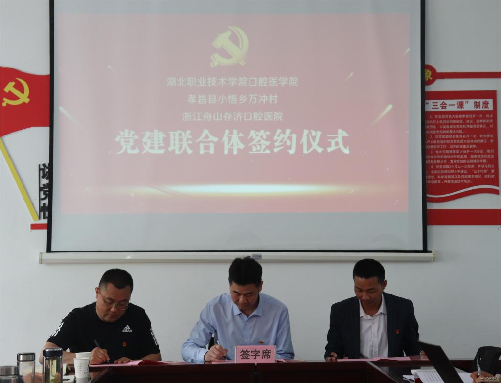 为创新基层党建工作载体,提高基层党建工作水平,汇聚各方力量积极落实三育人主体责任,4月14日,万象城awcsport官网党总支、孝昌县小悟乡万冲村党支部及浙江舟山存济口腔医院党支部在万冲村堂群服务中心举行校地企党建联合体签约仪式,小悟乡党委委员、副乡长刘颖主持活动。
