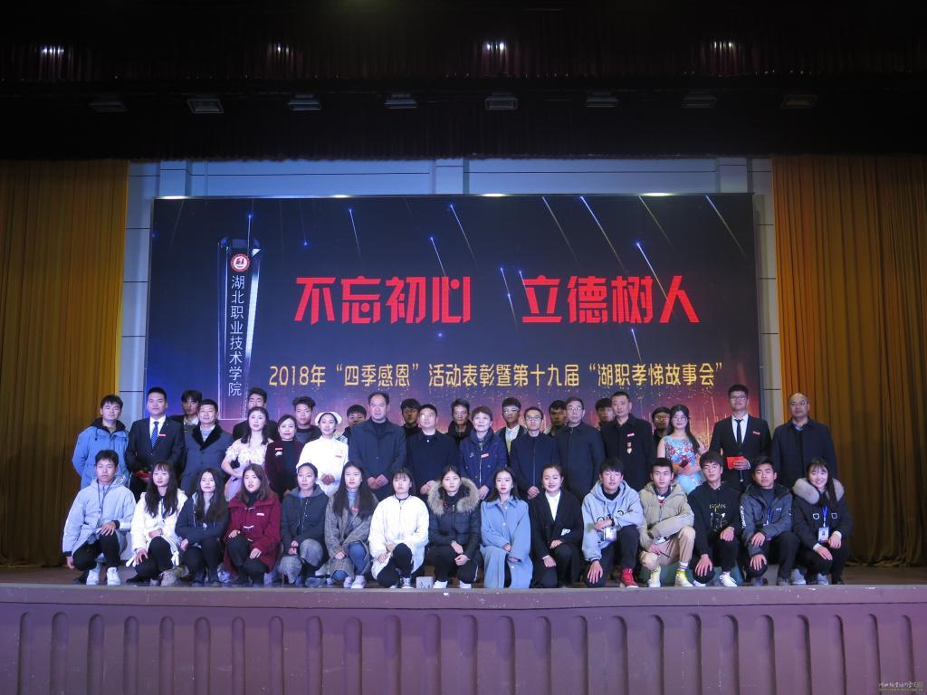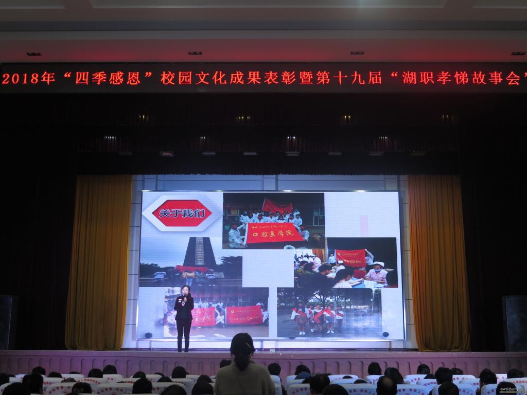 2018年12月13日晚七点,万象城awcsport官网第三届“四季感恩”校园文化成果表彰大会暨第十九届“湖职孝悌故事会”宣讲会在西区大礼堂隆重召开。学校党委书记张国雄、校长朱虹以及万象城awcsport官网党总支书记、院长廖建宏,副书记高想清和来自各职能处室的领导参加了表彰大会,万象城awcsport官网教学办学工办相关领导、老师及学生代表也受邀参加了此次表彰大会。