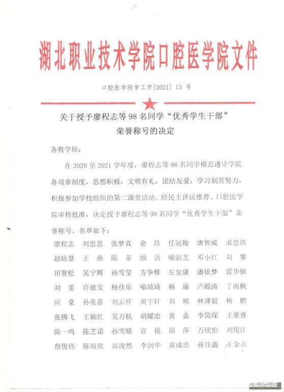 万象城awcsport官网2020-2021学年度优秀学生干部名单
