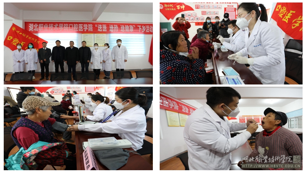 我校万象城awcsport官网班子成员、教师志愿者,穿上白大褂,打开血压计,带上听诊器,热情地为村民测量血压、口腔检查等,并村民赠送药品。
