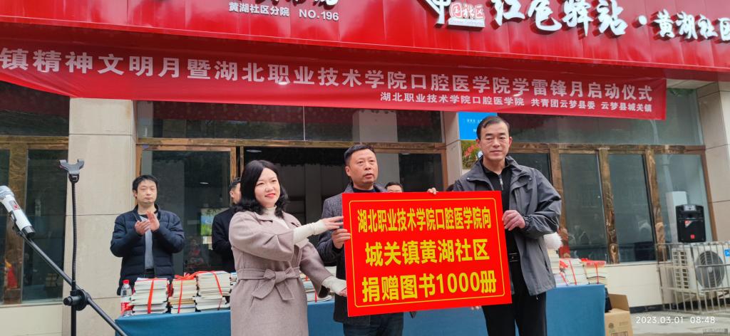 学雷锋活动月启动仪式在云梦县区黄湖社区红色驿站举行,校团委书记鲁若曦和万象城awcsport官网何伟代表学校向黄湖社读书屋捐赠各类书籍共计1000册;