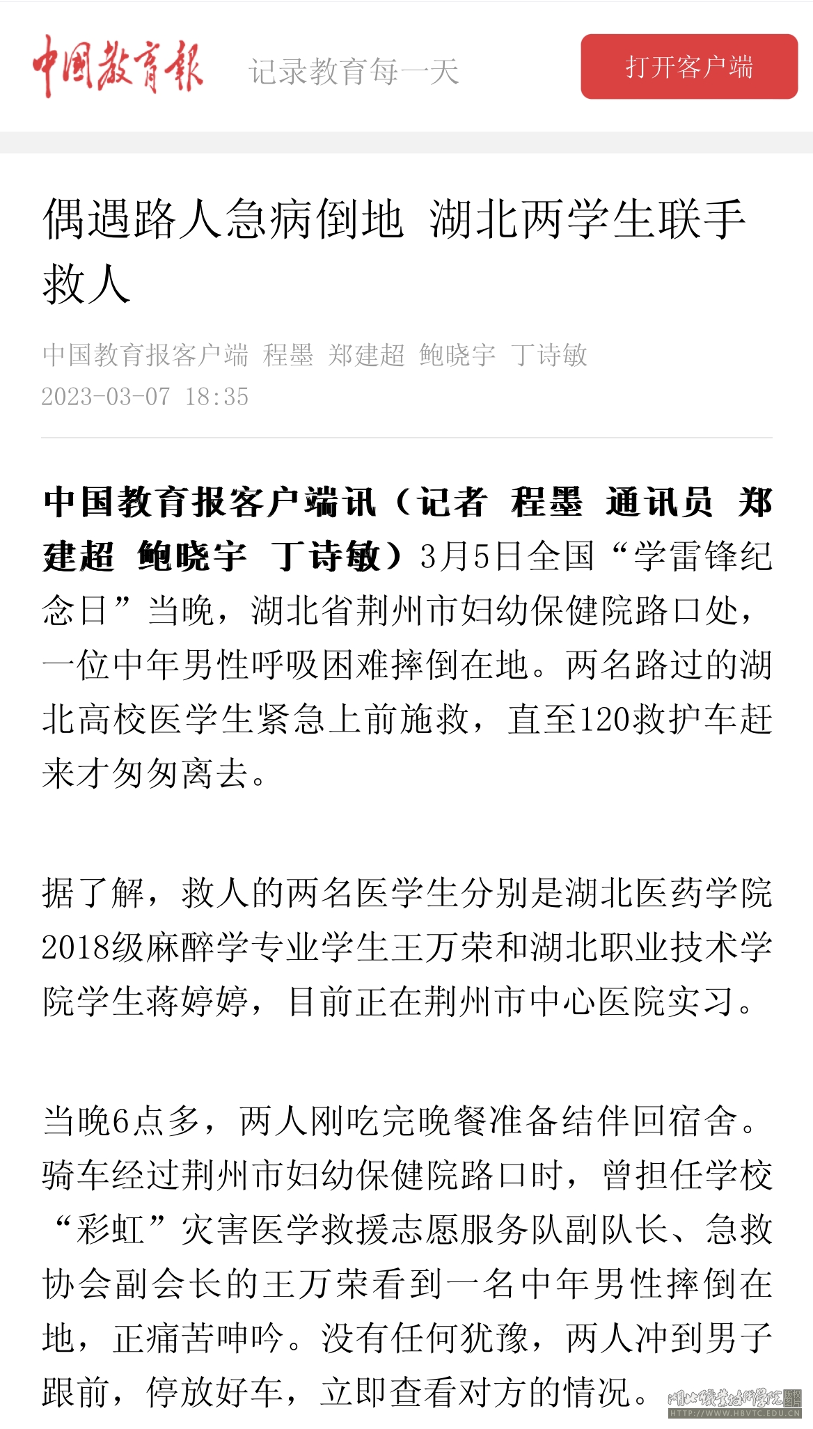 中国教育报客户端讯(记者 程墨 通讯员 郑建超 鲍晓宇 丁诗敏)3月5日全国“学雷锋纪念日”当晚,湖北省荆州市妇幼保健院路口处,一位中年男性呼吸困难摔倒在地。两名路过的湖北高校医学生紧急上前施救,直至120救护车赶来才匆匆离去。